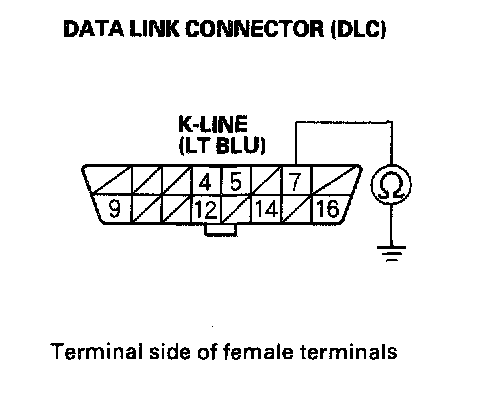 8. Check for continuity between DLC terminal No.7 and body ground.