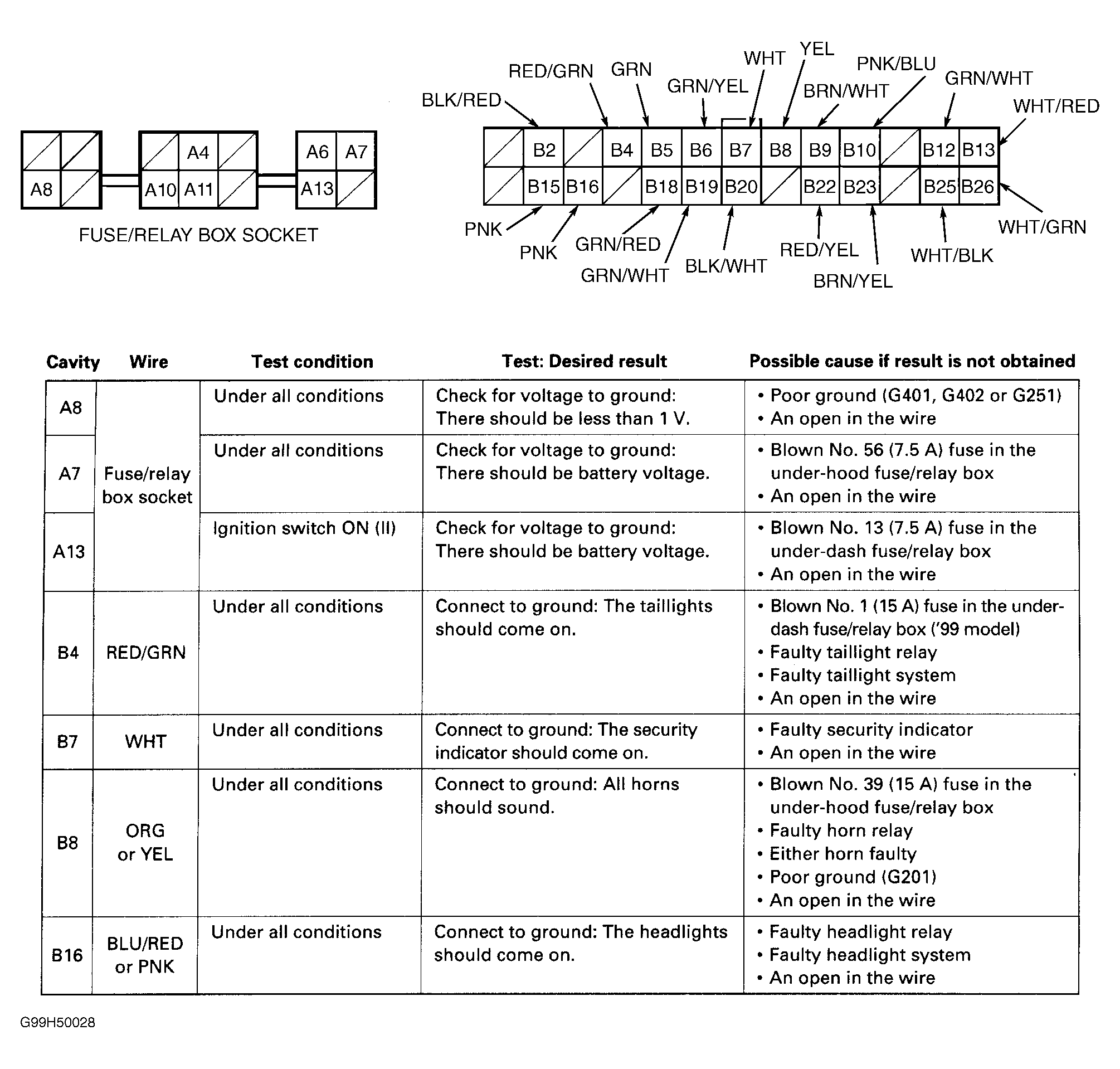 2. Reconnect driver's multiplex control unit to driver's underdash fuse/relay box. Perform input tests at back of fuse/relay box (backprobe). See Fig 2 . Repair as necessary. If all tests are okay, driver's multiplex control unit may be faulty. Substitute known-good driver's multiplex control unit and retest system. If problem still exists, go to PASSENGER'S MULTIPLEX CONTROL UNIT  .
