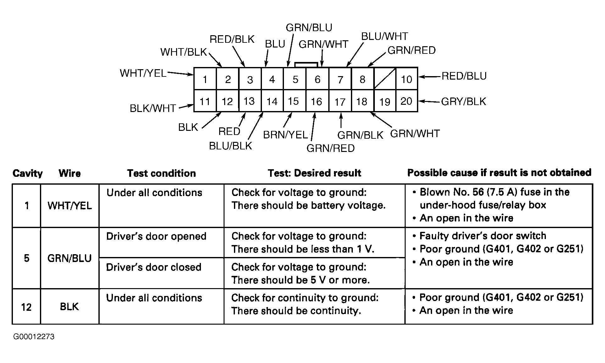 1. Remove driver's door panel. See DOOR PANEL  under REMOVAL & INSTALLATION. Remove door multiplex control unit (built into power window master switch). Disconnect multiplex control unit connector. Inspect connectors and terminals. Check for bent, loose or corroded terminals. Perform door multiplex control unit input tests. See Fig 1 . Repair as necessary and recheck system operation. If door multiplex control unit tests are okay, go to next step.