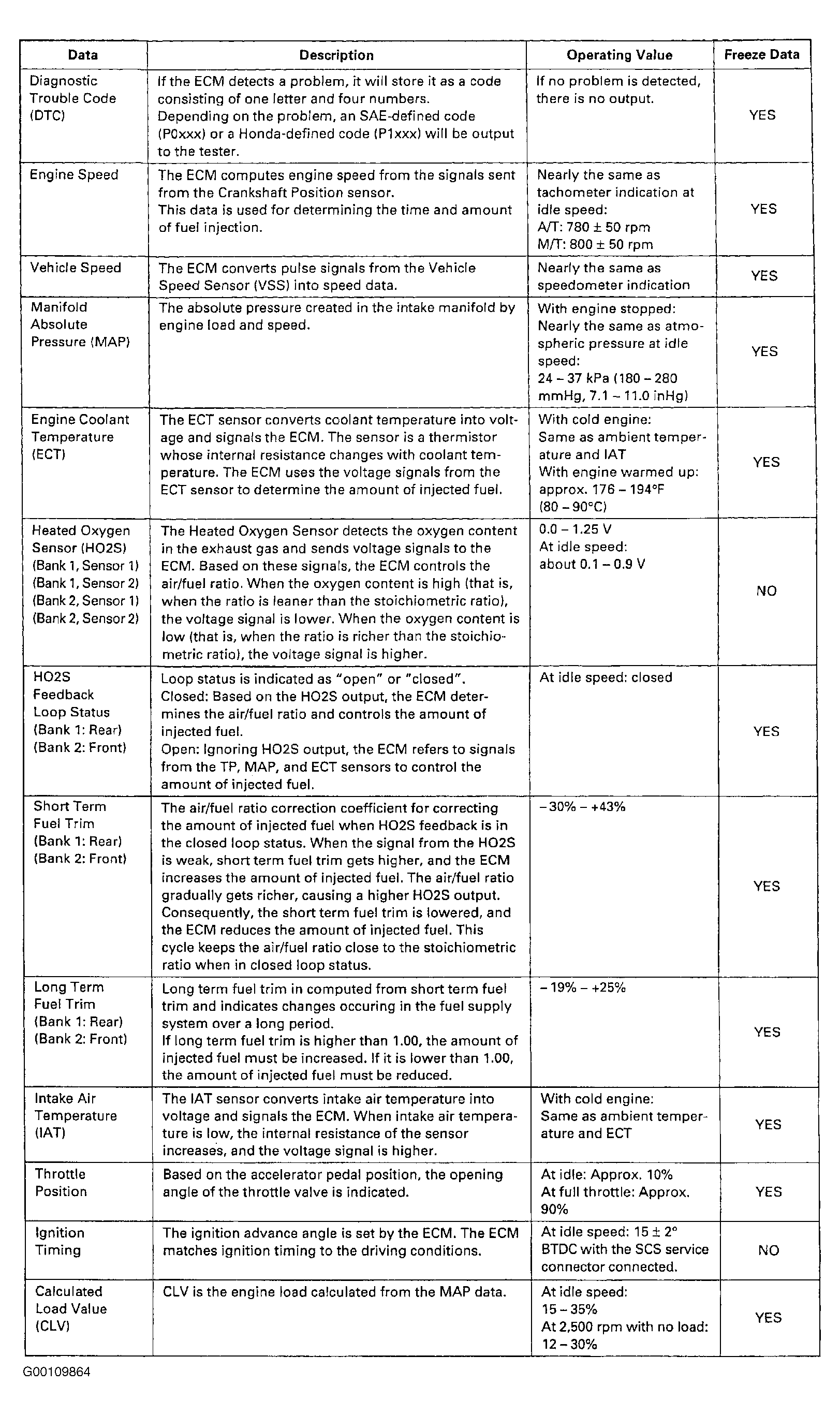 The OBD-II scan tool or Honda PGM Tester can read the Diagnostic Trouble Codes (DTC), freeze frame data, current data, and other Engine Control Module (ECM) data. Freeze frame data indicates the engine conditions when the first malfunction, misfire or fuel trim malfunction was detected. It can be useful information when troubleshooting.