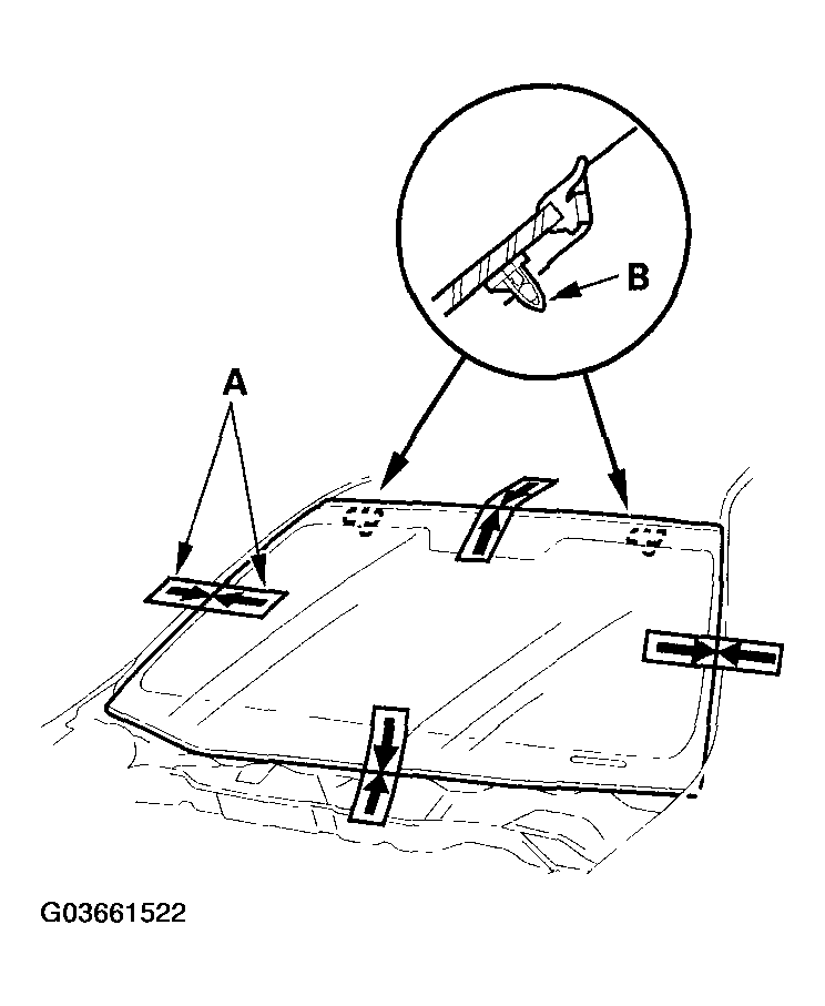 - Remove the molding (A) from the upper edge of the windshield (B). If necessary, cut the molding with a utility knife.