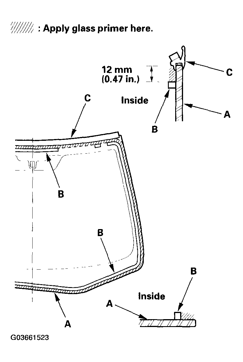 - With a sponge, apply a light coat of glass primer around the edge of the windshield (A) between the dams (B) and molding (C) as shown in Fig 8, then lightly wipe it off with gauze or cheesecloth: