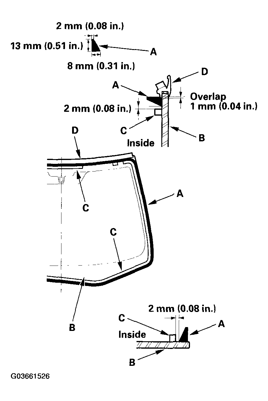 - Put the cartridge in a caulking gun, and run a bead of adhesive (A) around the edge of the windshield (B) between the dams (C) and molding (D) as shown in Fig 11. Apply the adhesive within 30 minutes after applying the glass primer. Make a slightly thicker bead at each corner.