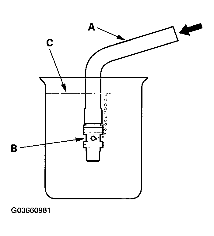 - Attach a hose (A) to the end of the flow control valve (B) as shown in Fig 3. Then submerge the flow control valve in a container of power steering fluid or solvent (C), and blow in the hose.