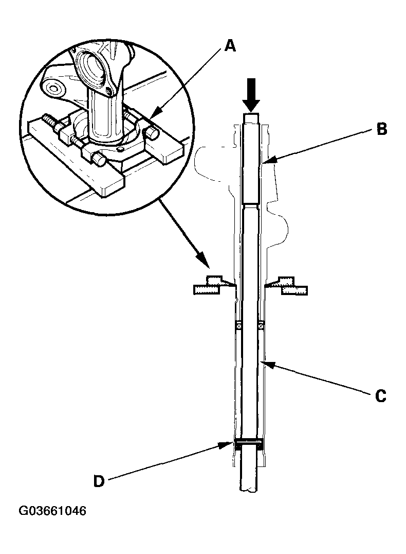 - Set the steering gearbox in a press so the gearbox housing side points upward, then press the cylinder end seal (D) and steering rack out of the gearbox. Hold the steering rack to keep it from falling when pressed clear. Be careful not to damage the inner surface of the cylinder housing with the tool.