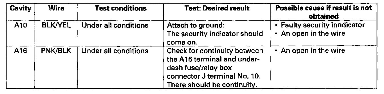 6. Reconnect all connectors to the under-dash fuse/relay box. Turn the ignition switch ON (II), and make these input tests at the appropriate connectors on the under-dash fuse/relay box.