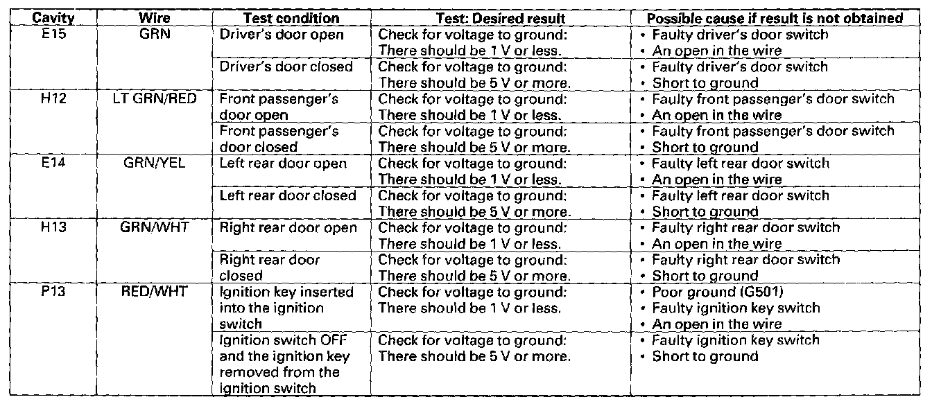 11. Reconnect the connector to the door multiplex control unit. Turn the ignition switch ON (II), and make these input tests at the appropriate connector.