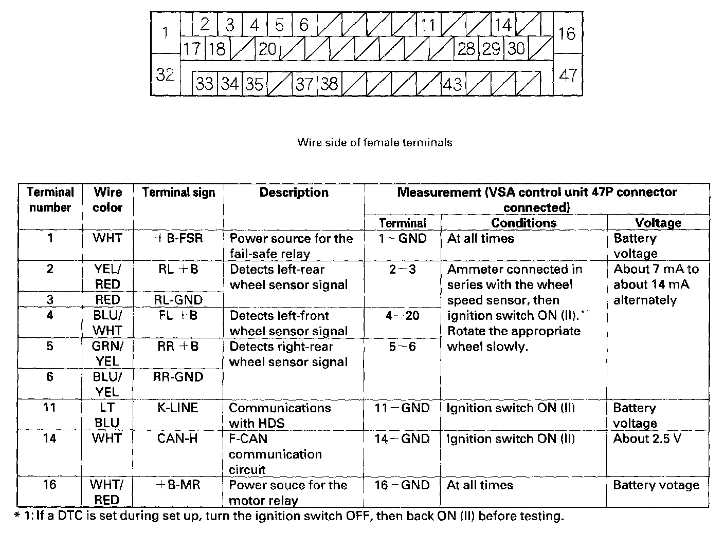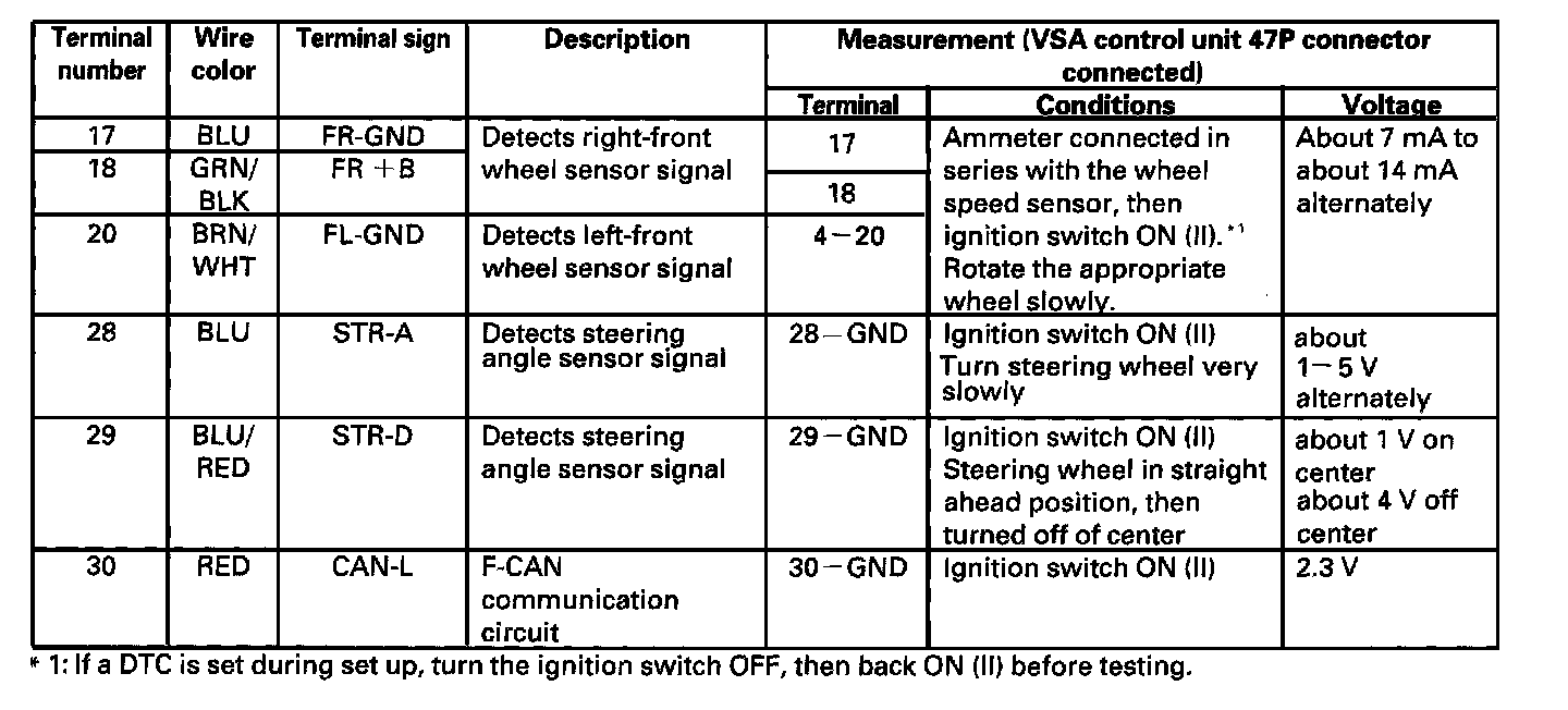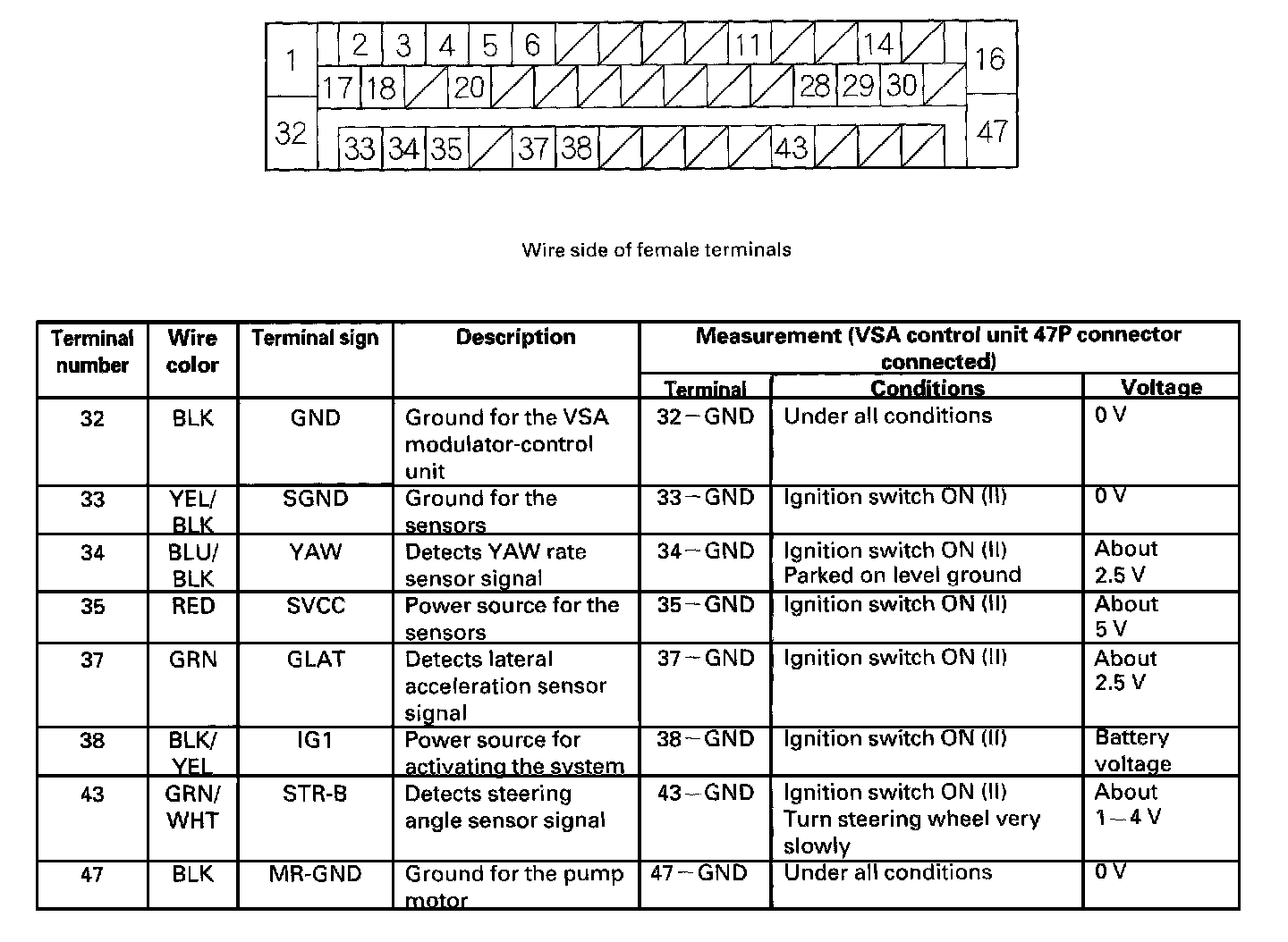 Inputs and Outputs for 47P Connector (connector attached to the VSA control unit. Back probe the terminals when testing in the table.)
