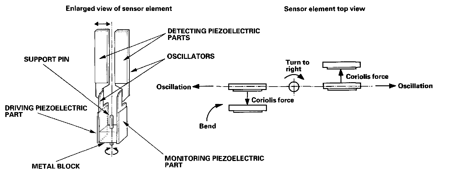 The piezoelectric parts have "electric/mechanical transfer characteristics. " They bend vertically when voltage is applied to both sides of the parts, and voltage is generated between both sides of the piezoelectric parts when they are bent by an external force. The oscillation gyro functions by utilizing this characteristic of the piezoelectric parts and "Coriolis force. " (Coriolis force deflects moving objects as a result of the earth's rotation.) In the oscillation gyro, this force moves the sensor element when angular velocity is applied.