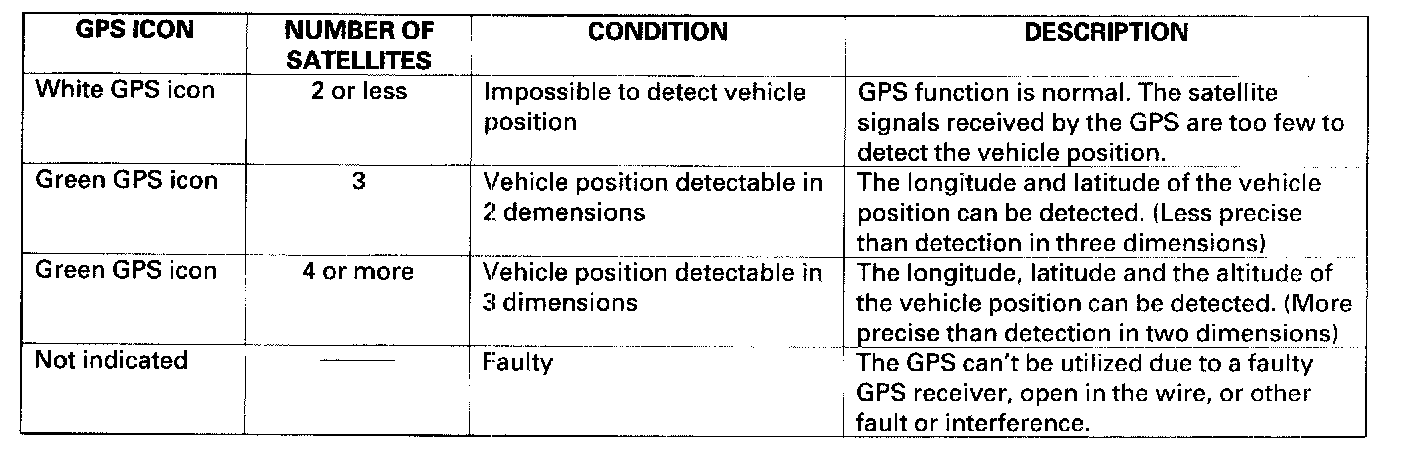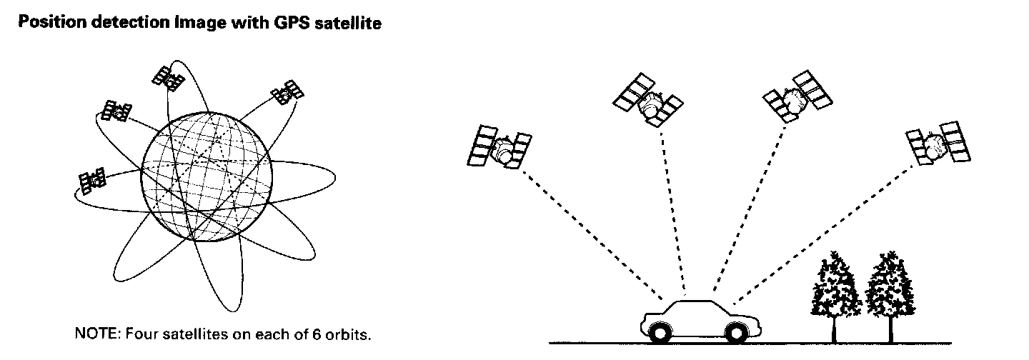 The global positioning system (GPS) enables the navigation system to determine the current position of the vehicle by utilizing the signals transmitted from the satellites in orbit around the earth. The satellites transmit the satellite identification signal, orbit information, transmission time signal, and other information. When the GPS receiver receives a signal from three or more satellites simultaneously, it calculates the current position of the vehicle based on the distance to each satellite and the satellite positions on their respective orbits.