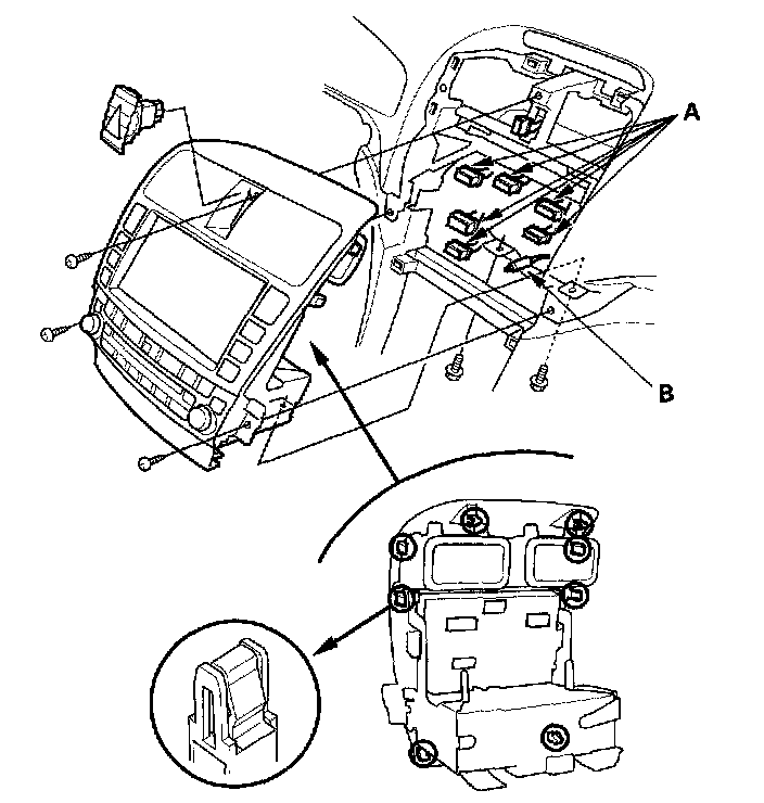4. Remove the screws and bolts. Disconnect the audio-HVAC-display module connectors (A) and the antenna lead (B), then remove the audio-HVAC display module.