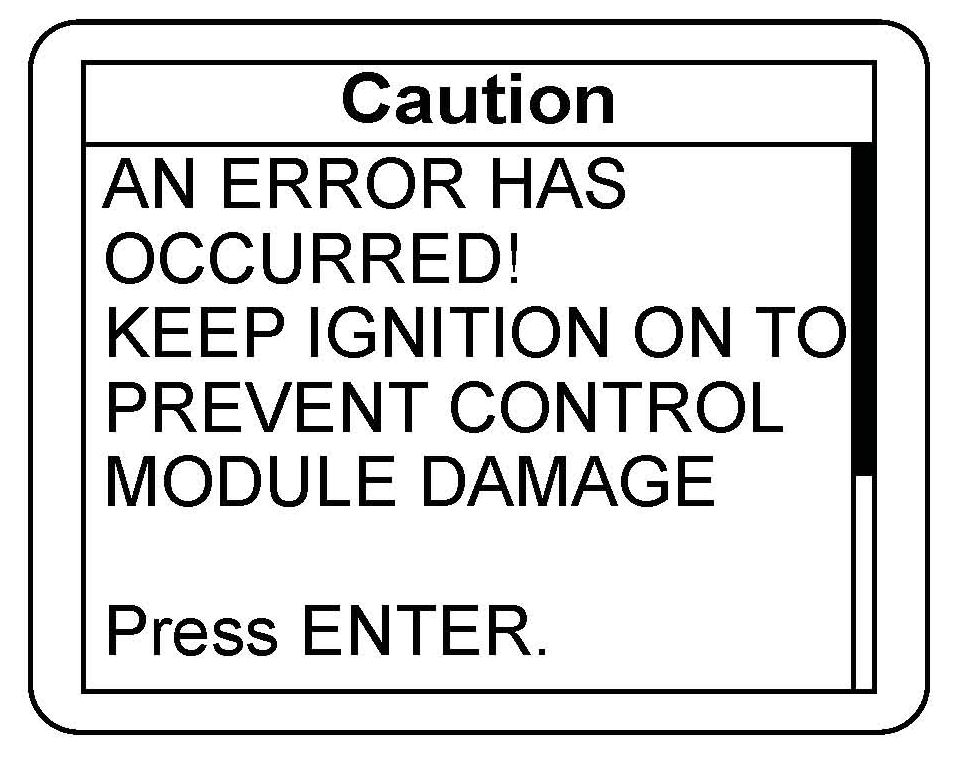 16. If an error occurs during the updating procedure, an error message appears. Keep the ignition switch in ON (II). Press ENTER to display the error code. Refer to the CM Update Error Code Table and Error Messages in the MVCI User Guide for more information about the code and its solutions.