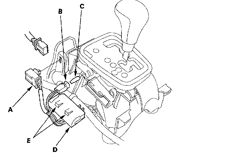 4. Remove the transmission gear selection switch/ park pin switch (D) by releasing the lock tabs (E).