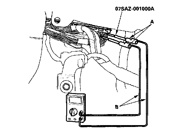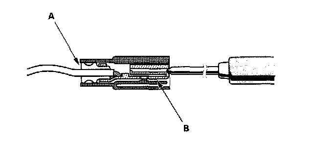 3. If you cannot get to the wire side of the connector or the wire side is sealed (A), disconnect the connector and probe the terminals (B) from the terminal side. Do not force the probe into the connector.