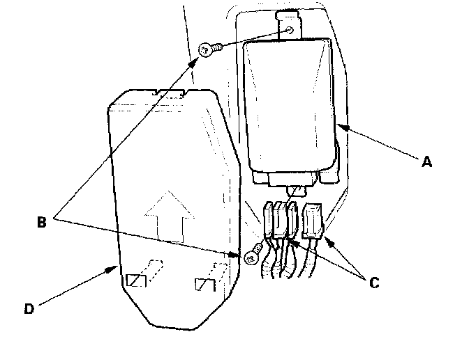 1. Place the new OPDS unit (A) on the seat-back frame. Tighten the two screws (B), and connect the OPDS unit harness 8P and sensor connectors (C) to the OPDS unit. Reinstall the cover (D).
