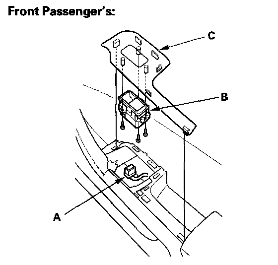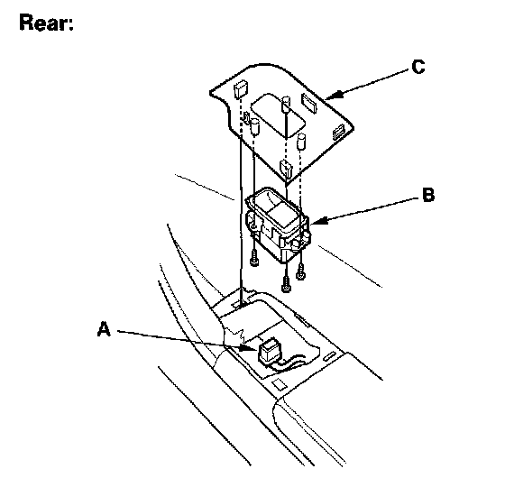 2. Disconnect the power window switch connector (A), then remove the three mounting screws and the power window switch (B) from the switch trim (C).