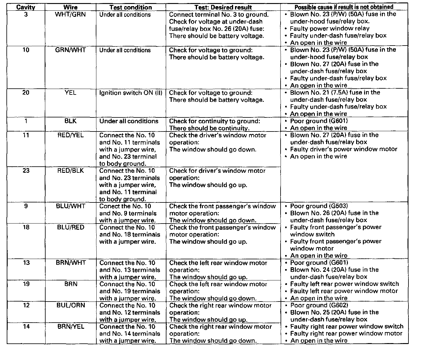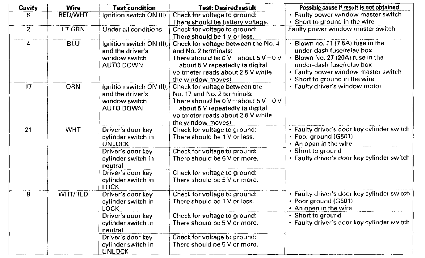 5. With the power window master switch still disconnected, make these input tests at the connector.