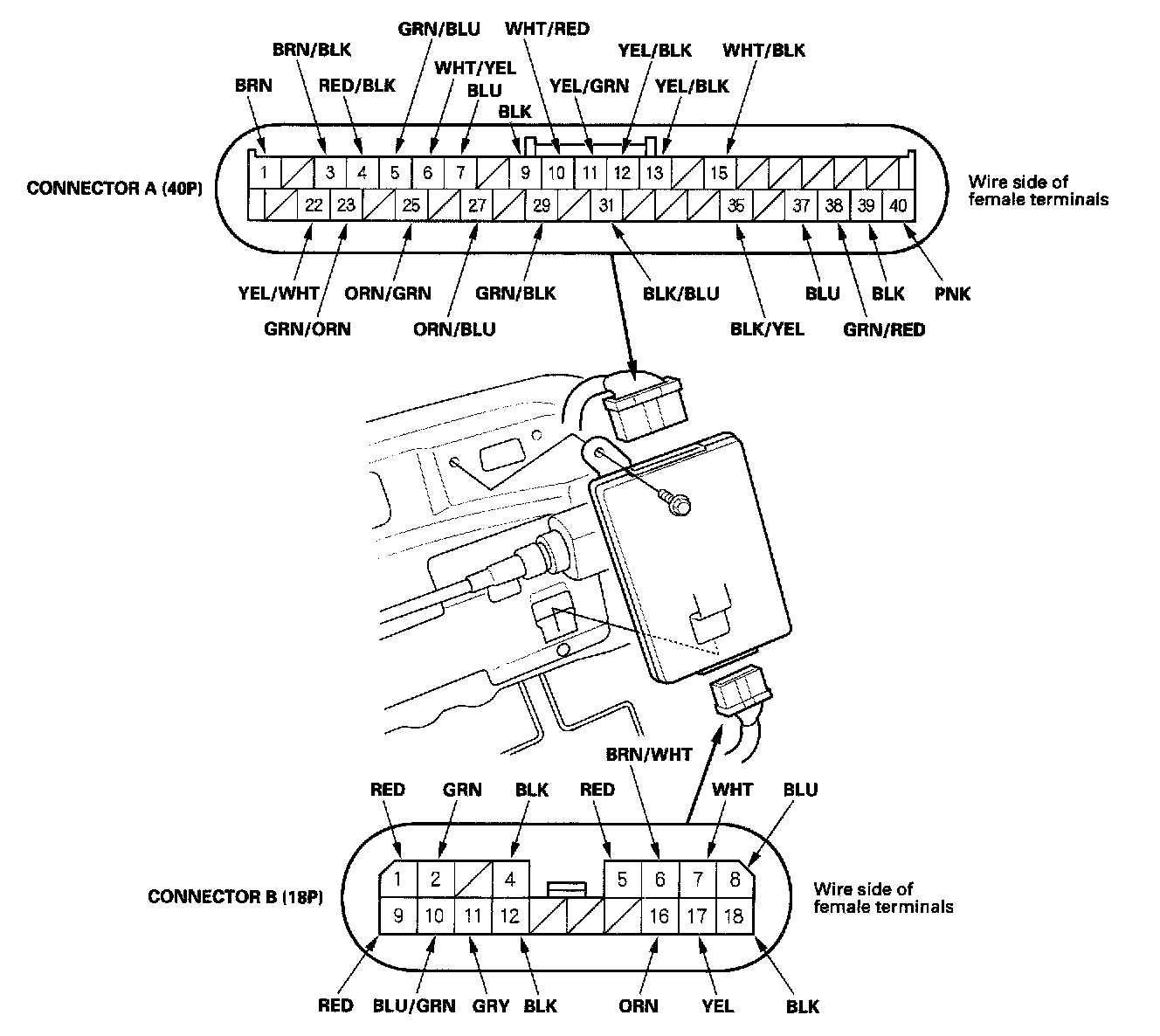 3. Disconnect the 40P connector (A) and 18P connector (B) from the power seat control unit (C).