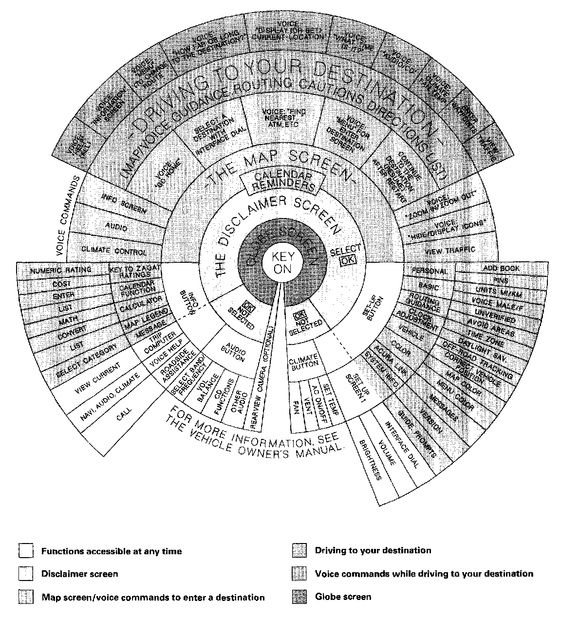 System Function DiagramThis diagram shows the features of the navigation system starting at the center and working outward in layers. The navigation program starts at "Key ON", and then displays the globe screen. Once the disclaimer screen is acknowledged, the next shaded portions of the diagram become active. However, some functions of the INFO and SET UP buttons, and all functions of the AUDIO and A/C buttons can be accessed immediately after the globe screen (white).