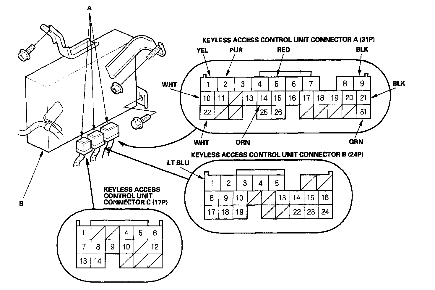 6. Reconnect the connectors to the keyless access control unit, and make these input tests at the connectors.