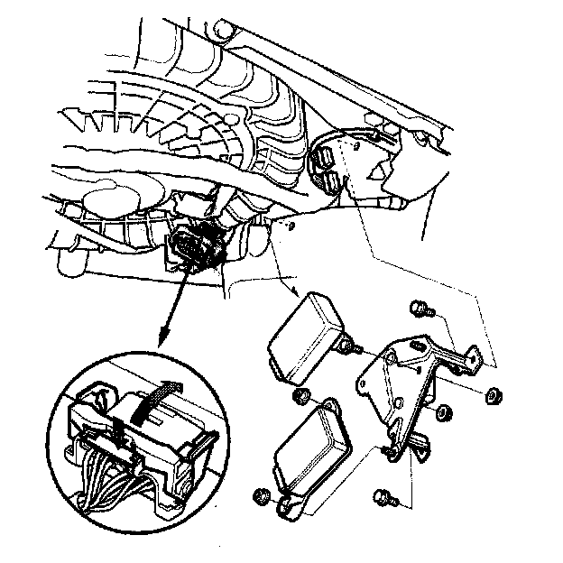3. Remove the bolts from the bracket that holds the hands free link control unit, the throttle actuator control module, and the adaptive cruise control (ACC) unit.