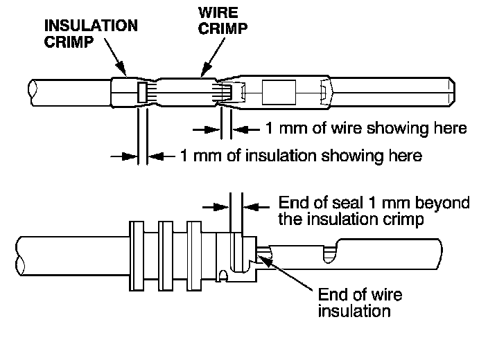 3. Strip the insulation off the end of the wire so the wire fits in the new terminal as shown. (If the wire has a wire seal, replace it with a new one from the kit.)