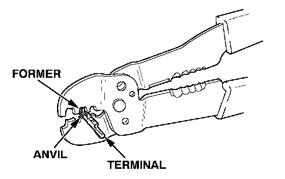 4. Position the terminal in the crimping tool slot with the solid portion of the terminal toward the anvil and the open section toward the former.