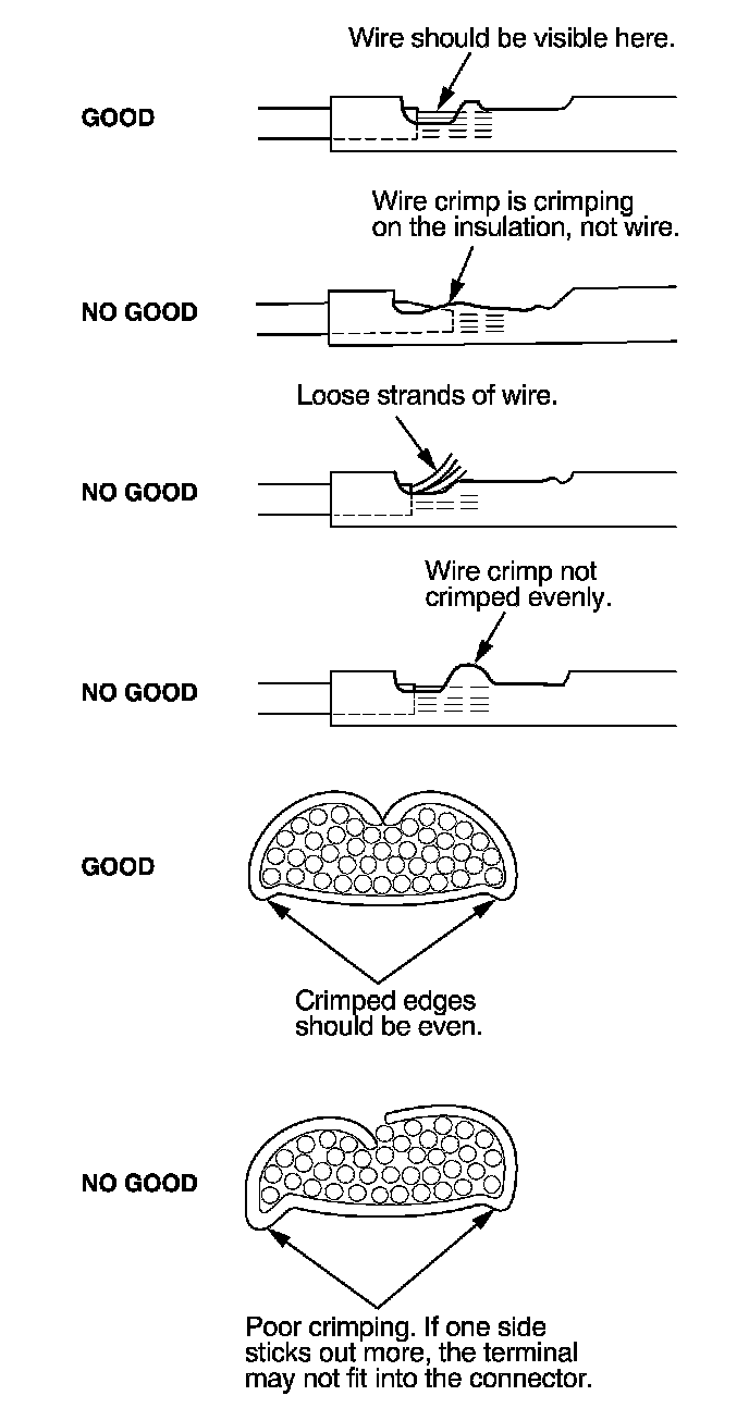 8. Inspect the quality of the wire crimp. If it has any of the following NO GOOD crimps, cut it off and start over.