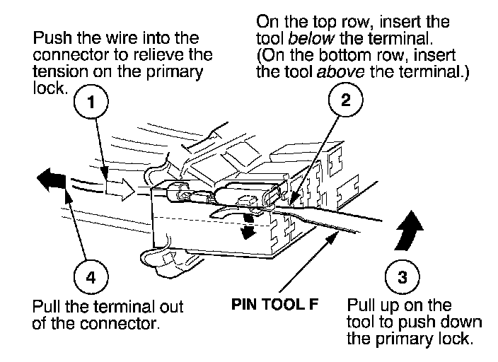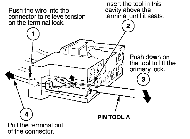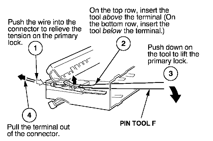 Before you begin, inspect the wire you are about to repair for damage and length. Make sure the wire will be long enough to make a terminal repair without stretching it when you reinstall the terminal in the connector. If the wire is too short, or if access to the connector is too restricted to make a terminal repair, you may need to install a pigtail terminal (a short length of wire with a factory-crimped terminal on it). Refer to HOW TO INSTALL PIGTAIL TERMINALS.