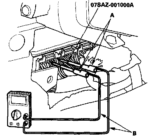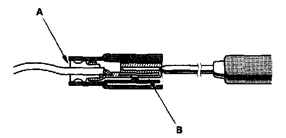 3. If you cannot get to the wire side of the connector or the wire side is sealed (A), disconnect the connector and probe the terminals (B) from the terminal side. Do not force the probe into the connector.
