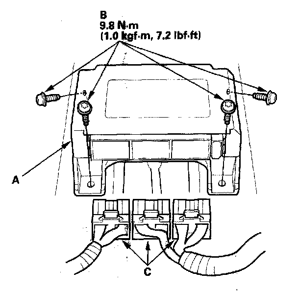 1. Install the new SRS unit (A) with the Torx bolts (B) then connect the connectors (C) to the SRS unit; push them into position until they click.