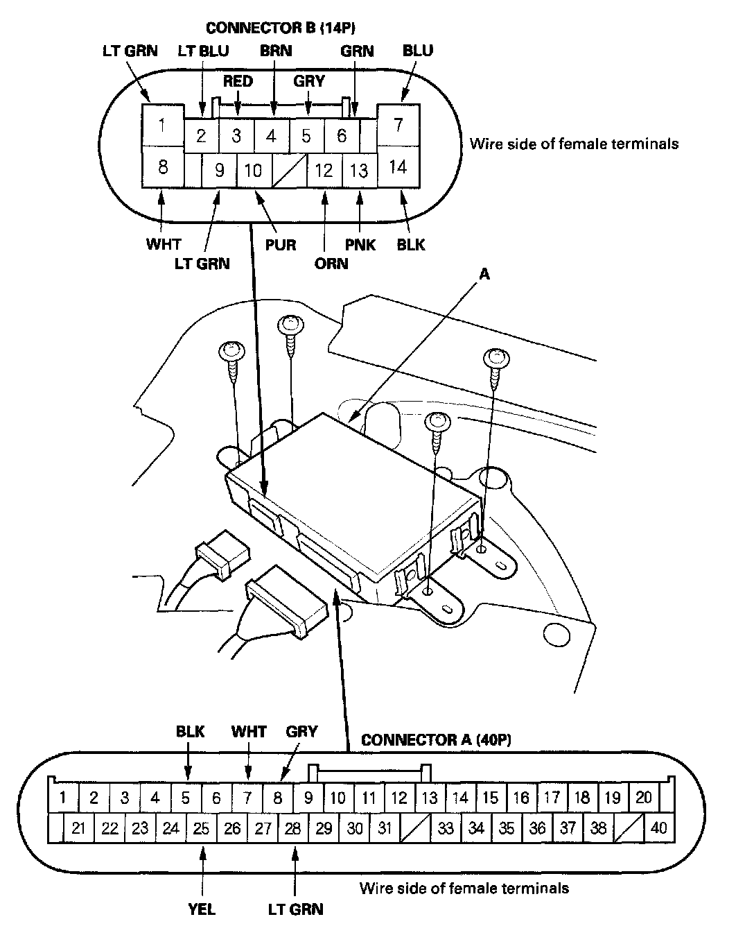 3. Disconnect the driver's MPCS unit (A) connectors A (40P) and B (14P).