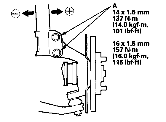 NOTE: The camber angle can be adjusted up to ±15' (center of tolerance) by replacing one damper pinch bolt with the adjusting bolt. The camber angle can be adjusted up to ±30' by replacing both upper and lower damper pinch bolts with the adjusting bolts.