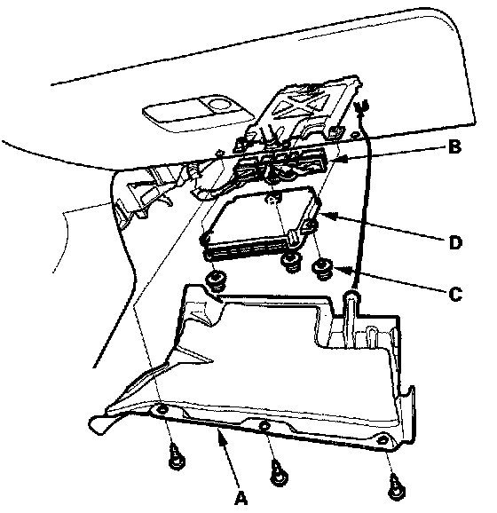 7. Remove the ECM/PCM mounting bolts (C) and the ECM/PCM (D).