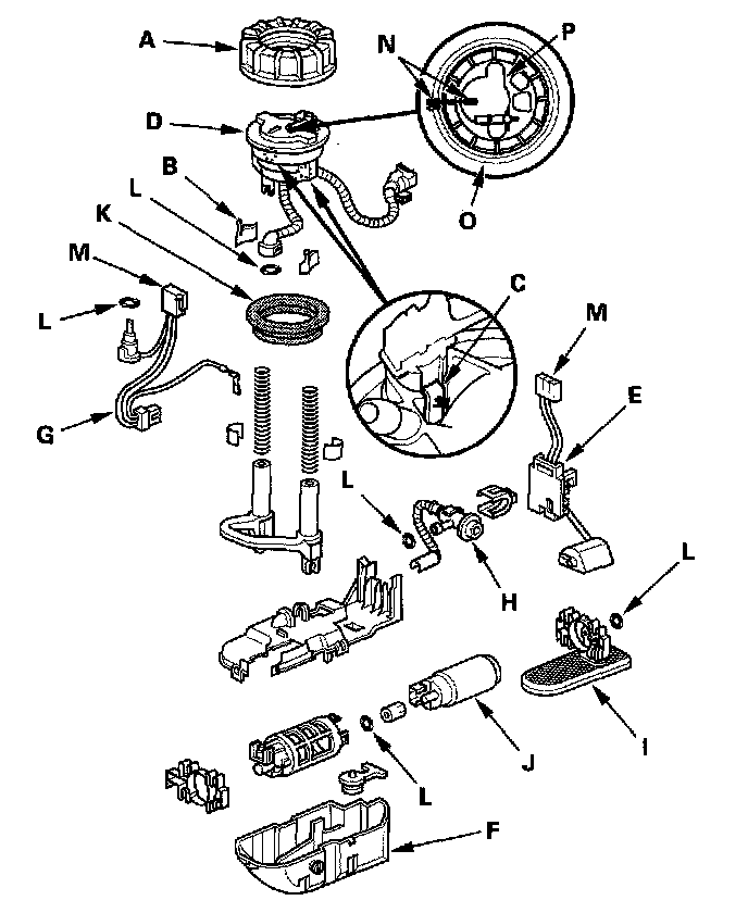 11. Install the fuel tank unit in the reverse order of removal with a new locknut, a new base gasket (K) and new O-rings (L), then check these items: