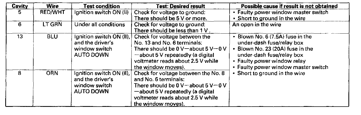 Master Switch Input TestNOTE: The power window control unit is built into the power window master switch, and it only controls the driver's window operations.