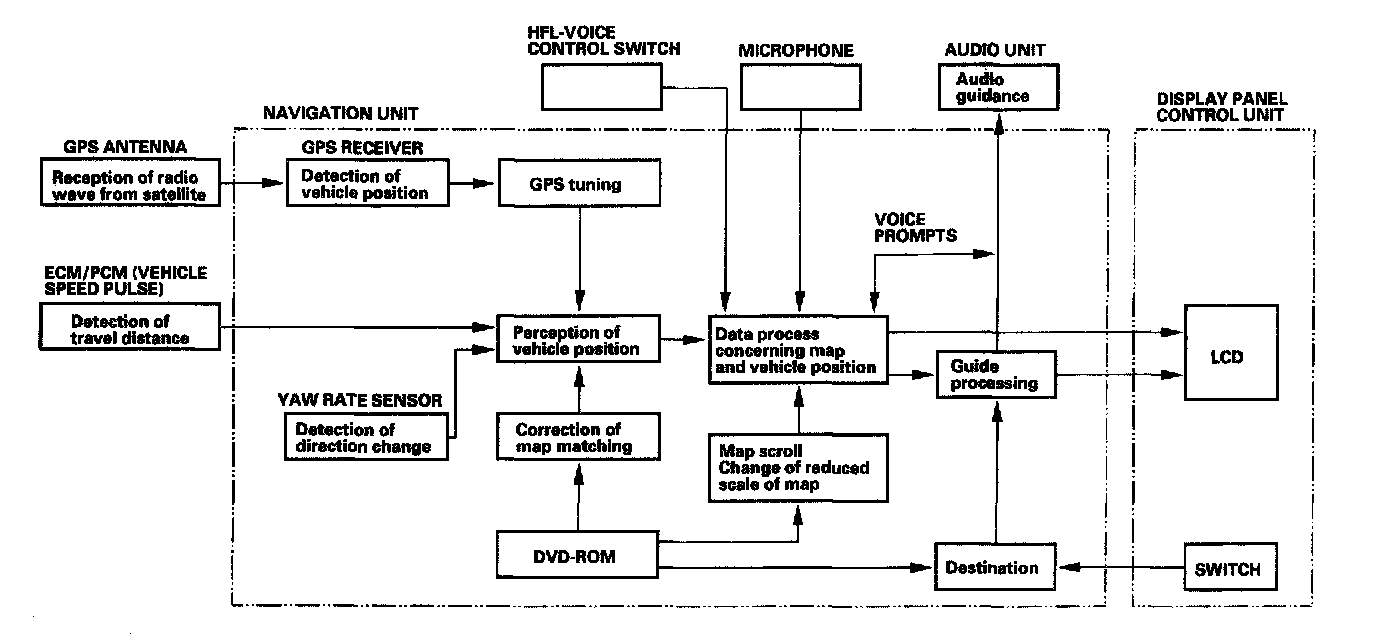 The navigation system is composed of the navigation unit, the ECM/PCM (vehicle speed signal), the GPS antenna, microphone, voice control switch, audio unit and the display panel control unit.
