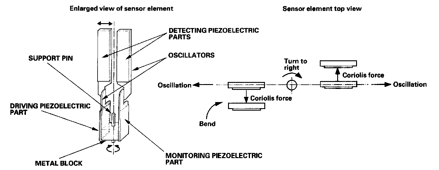 The piezoelectric parts have "electric/mechanical transfer characteristics". They bend vertically when voltage is applied to both sides of the parts, and voltage is generated between both sides of the piezoelectric parts when they are bent by an external force. The oscillation gyro functions by utilizing this characteristic of the piezoelectric parts and "Coriolis force". (Coriolis force deflects moving objects as a result of the earth's rotation.) In the oscillation gyro, this force moves the sensor element when angular velocity is applied.