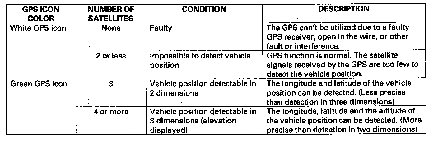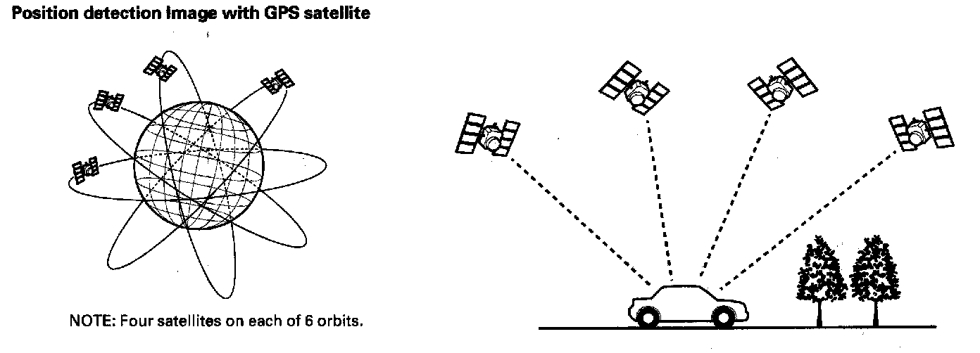 The global positioning system (GPS) enables the navigation system to determine the current position of the vehicle by utilizing the signals transmitted from the satellites in orbit around the earth. The satellites transmit the satellite identification signal, orbit information, transmission time signal, and other information. When the GPS receiver receives a signal from three or more satellites simultaneously, it calculates the current position of the vehicle based on the distance to each satellite and the satellite's position in its respective orbit.