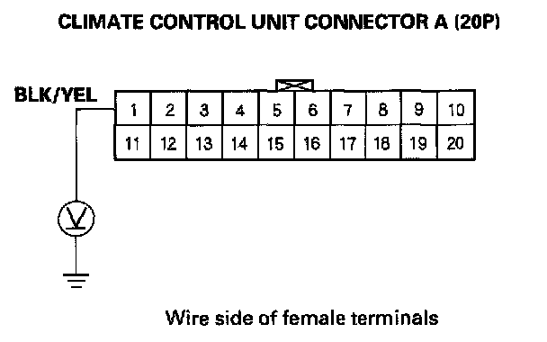 4. Measure the voltage between the No. 1 terminal of climate control unit connector A (20P) and body ground.