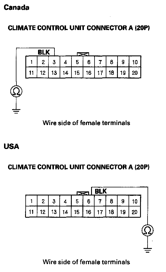 6. Check for continuity between the No. 3 (Canada) or No. 6 (USA) terminal of climate control unit connector A (20P) and body ground.