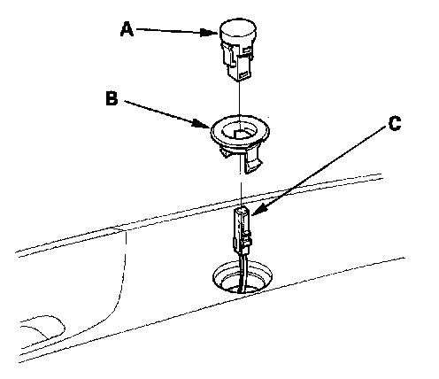 1. Remove the sunlight sensor (A) from the sunlight sensor garnish (B), then disconnect the 2P connector (C). Be careful not to damage the sensor and the dashboard.