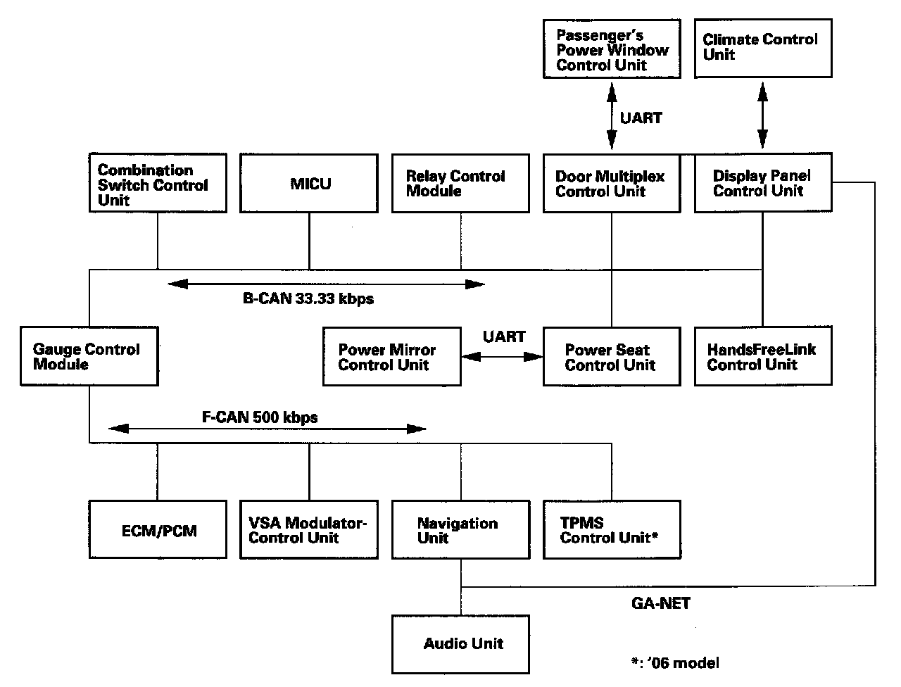 The fast controller area network (F-CAN) and the body controller area network (B-CAN) share information between multiple electronic control units (ECUs). B-CAN communication moves at a slower speed for convenience related items and for other functions. F-CAN information moves at a faster speed for "real time" functions such as fuel and emissions data. To allow both systems to share information, the gauge control module translates information from the B-CAN to the F-CAN and from the F-CAN to the B-CAN.