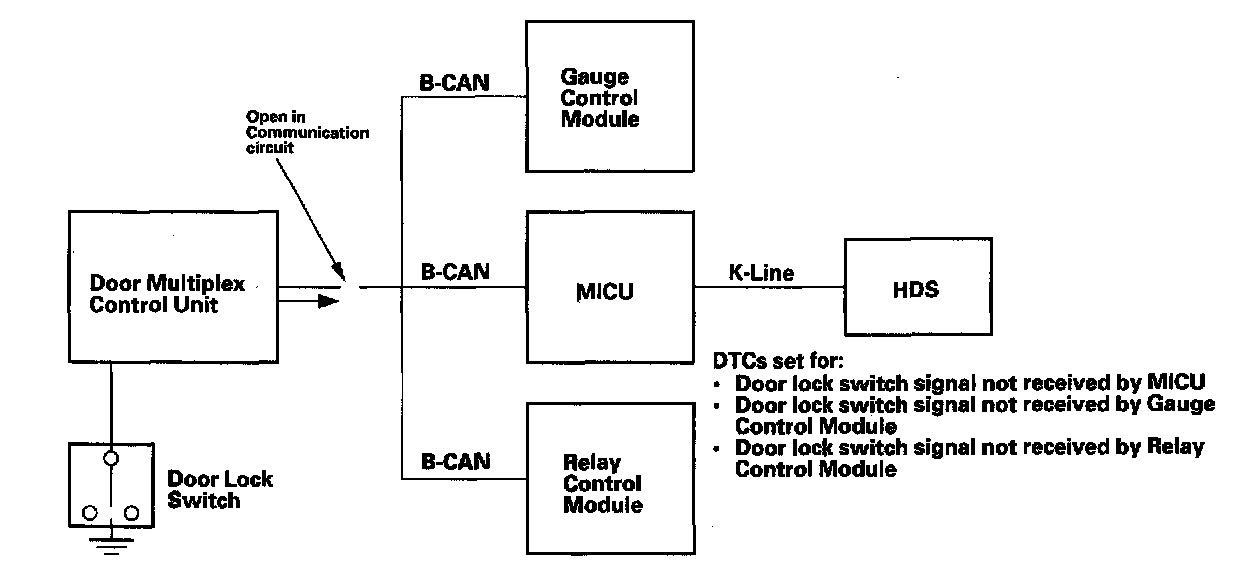 Since there is a break in the communication circuit, the door lock switch signal could not be received by the gauge control module, multiplex integrated control unit (MICU), or the relay control module. Each of these units will set "loss of communication" error codes for the signal(s) they did not receive. There may be multiple communication DTCs if the unit that has become disconnected from the network would normally transmit multiple messages during the communication line test. For example, the door multiplex control unit sends the keyless panic signal and door lock switch signal during the communication circuit test.