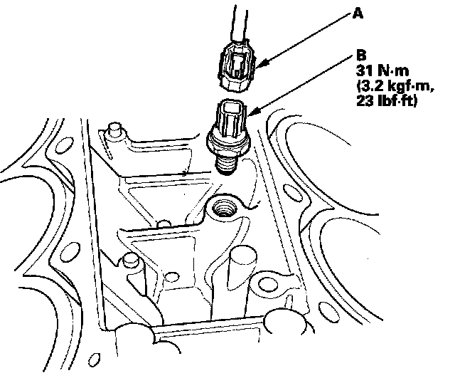 3. Disconnect the knock sensor connector (A), then remove the knock sensor (B).