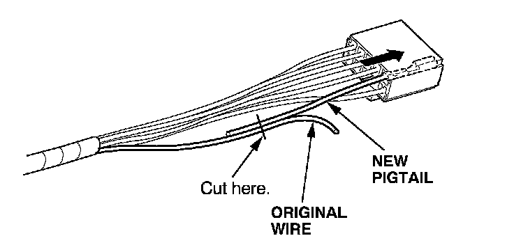 6. Lay the pigtail and the original wire side-by-side, and cut off both ends at once. If you are making more than one splice, do not cut each pigtail at the same location; the resulting "lump" of splice connectors would interfere with rewrapping the harness. Instead, cut the first pigtail close enough to the terminal so you will have room to make each remaining cut about 20 mm (3/4 inch) farther down on the next pigtail.