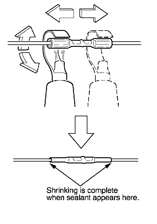 13. Plug in the heat gun, and turn it on. Start at the middle of the splice connector, and move the gun toward the ends as the tube shrinks. Apply heat evenly by rotating the curved heat spreader around the splice connector. Shrinking is complete when a small amount of sealant appears at each end of the tube.