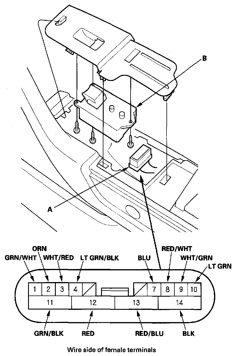3. Disconnect the 14P connector (A) from the front passenger's power window switch (B).