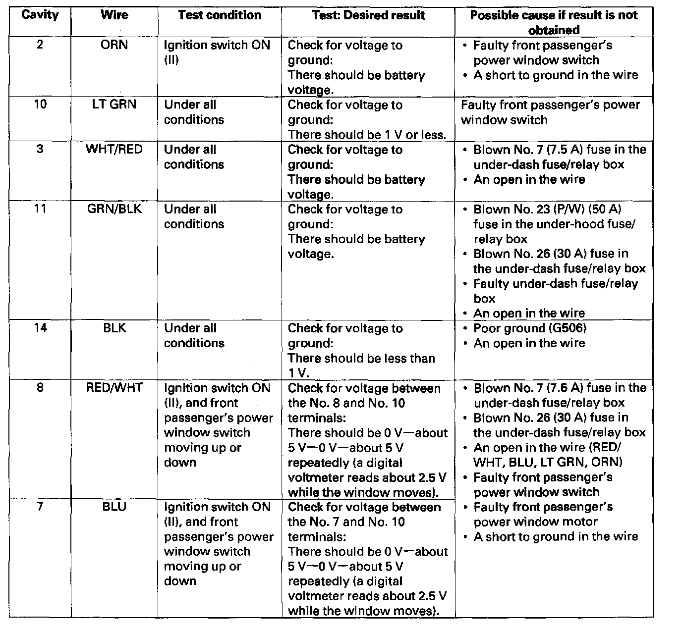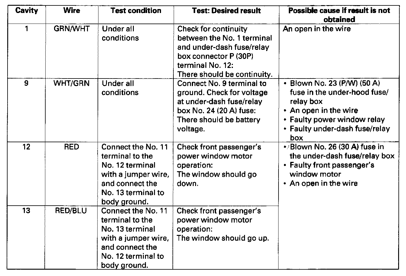 5. With the front passenger's power window switch still disconnected, make these input tests at the connector.