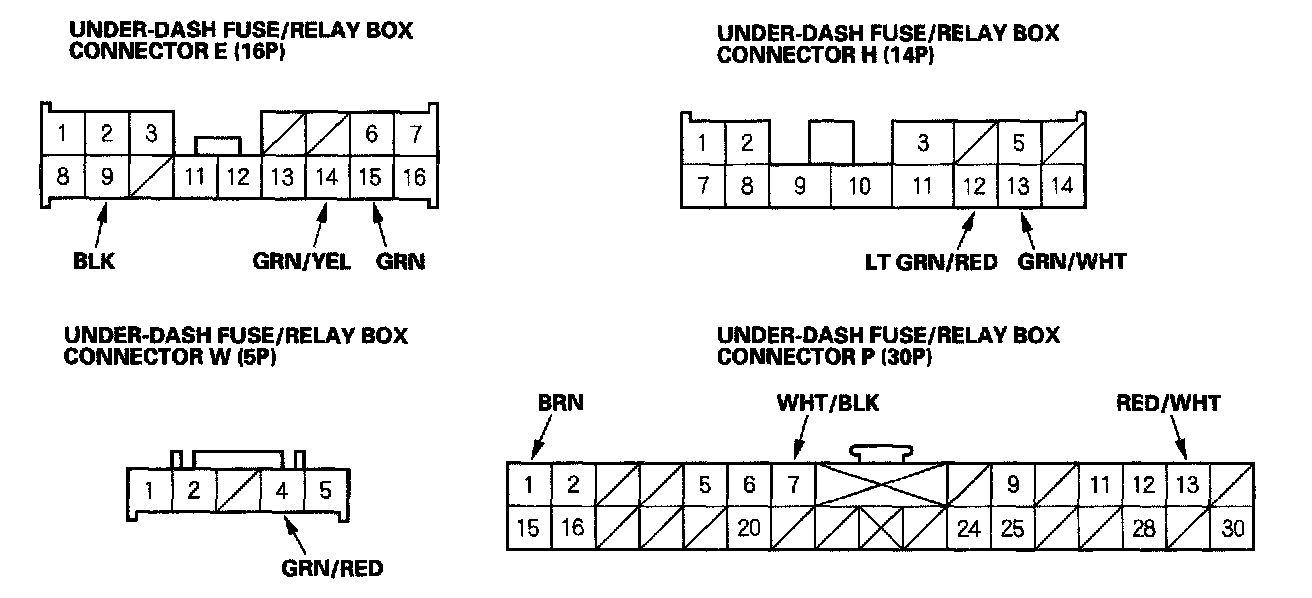 6. Disconnect the under-dash fuse/relay box connectors P (30P) and W (5P), and make these input tests at the connector.
